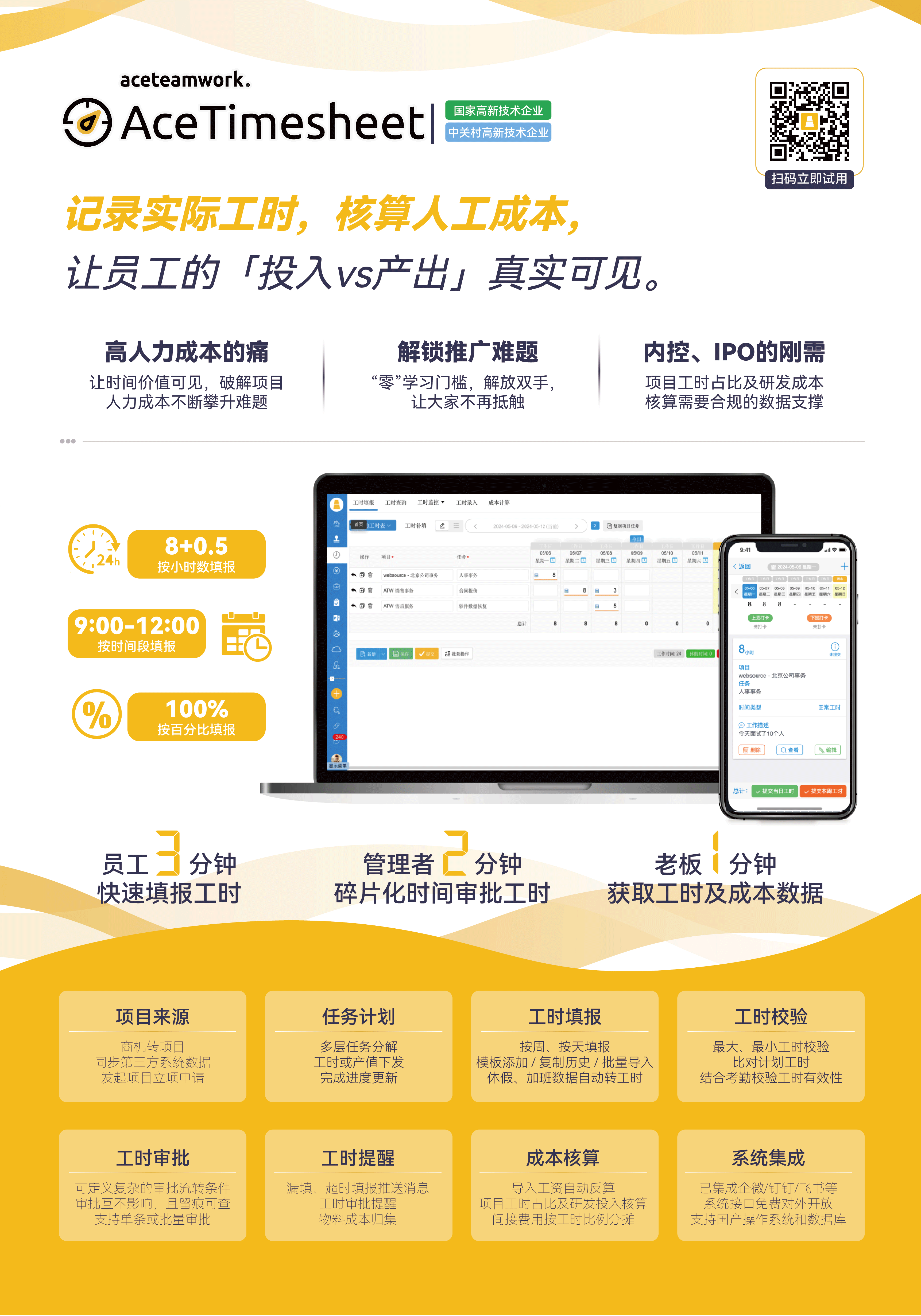 在数字经济浪潮下,时间成本管理不再是简单粗放的工时数据收集,而是需要关联到业务项目、业务内容及合理且有效的客观数据。对于项目团队而言,高效且有效的进行时间及成本管理,关乎企业战略布局与核心竞争力的深化。AceTeamwork旗下产品——AceTimesheet在线智能时间管理系统,正是为了帮助企业高效捕捉、管理与利用每一分钟而生。通过其先进且易用的功能集合,不仅简化了传统的工时记录与管理流程,更为企业带来了实质性的效益和竞争力提升。