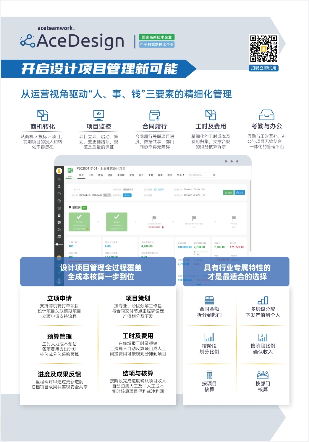 AceTeamwork 旗下专为设计院打造的“AceDesign设计项目综合管理系统”脱颖而出,凭借其成熟的设计项目过程和成本核算引擎、灵活的产值绩效管理及深厚的行业积淀,成为用户筑数字化转型的坚实基座!