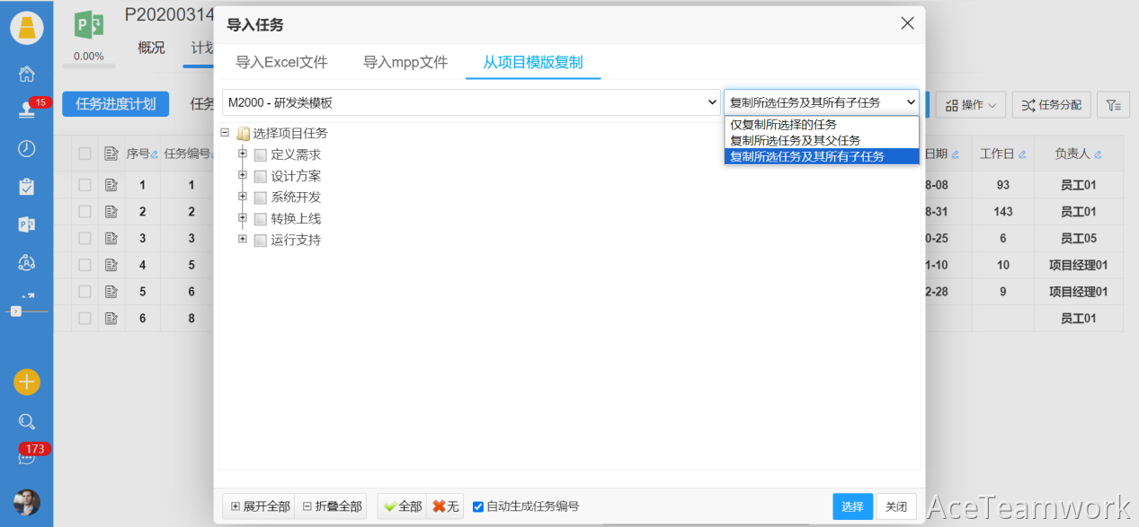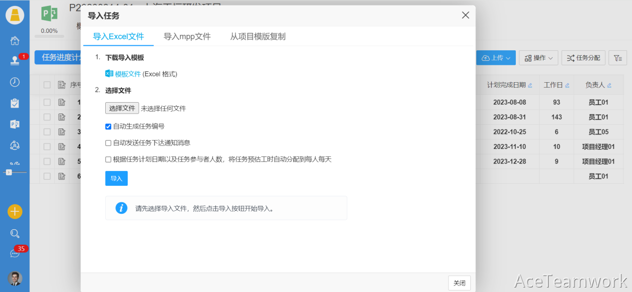 任务计划页面,也支持任务信息的“导入”功能。支持导入Excel文件、导入mpp文件、从项目模板复制任务。