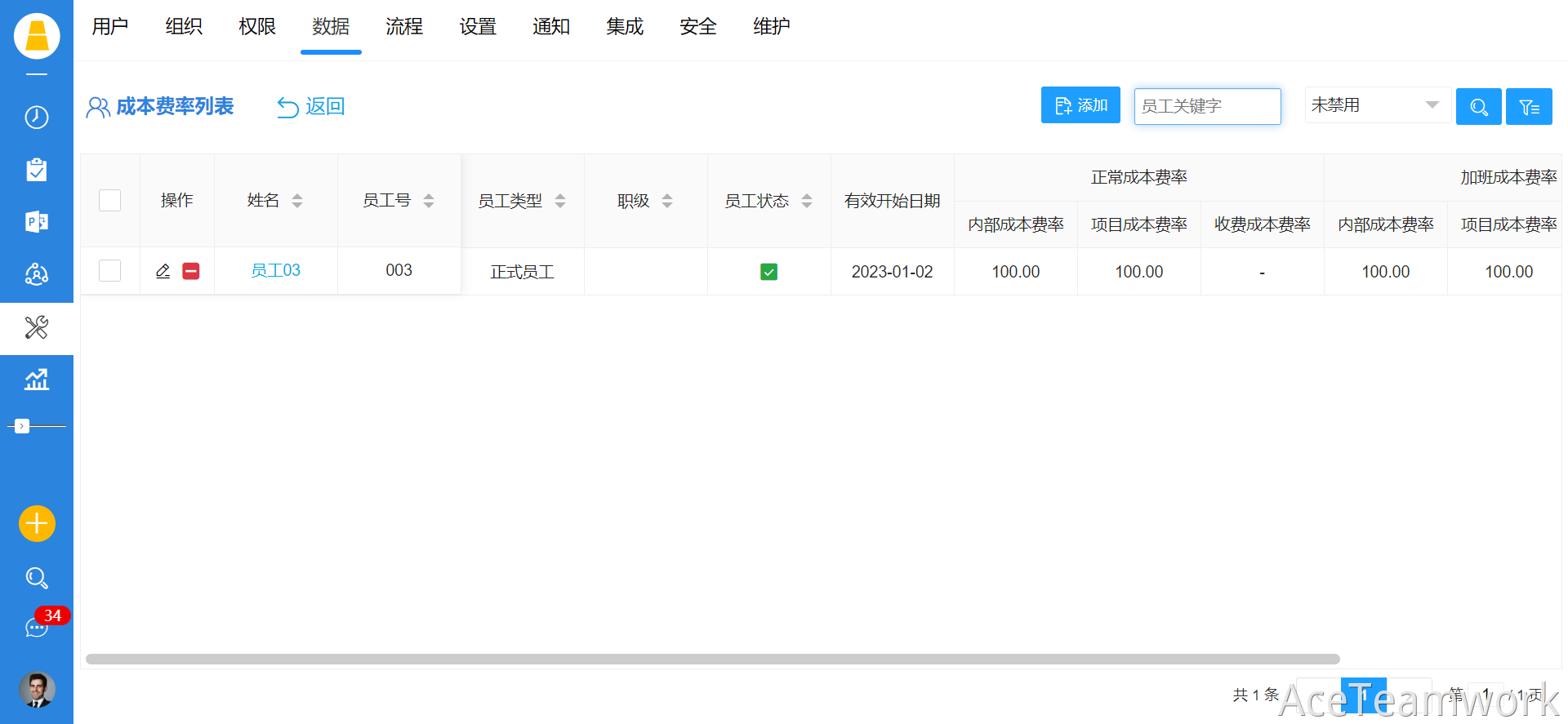 1、登录PC端系统管理员账号,进入首页→点击左侧导航栏的“设置”菜单→进入系统设置页面→点击主页面上方的“数据”菜单→再点击“人工成本费率”子菜单,进入人工成本费率列表页面。