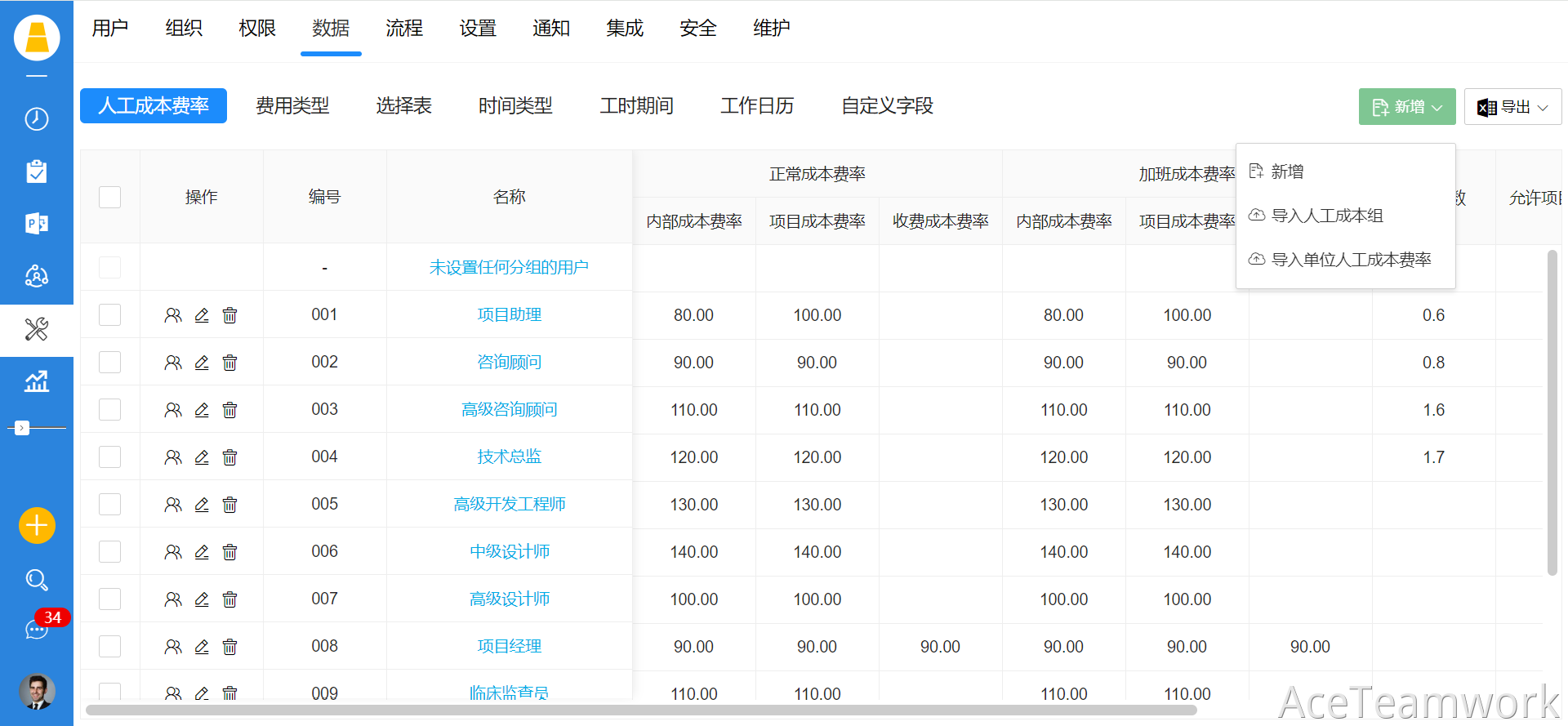 1、登录PC端系统管理员账号,进入首页一点击左侧导航栏的”设置”菜单→进入系统设置页面—点击主页面上方的“数据”菜单→“人工成本费率”子菜单→进入人工成本费率列表页面;点击“成本组”名称,或者点击“未设置任何分组的用户”,进入的是成本费率用户列表页面;