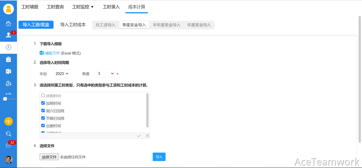 支持导入季度奖金、半年度奖金、年度奖金导入的方式,通过奖金与实际工时的计算和分摊,将对应的成本分摊到每个工时数据。