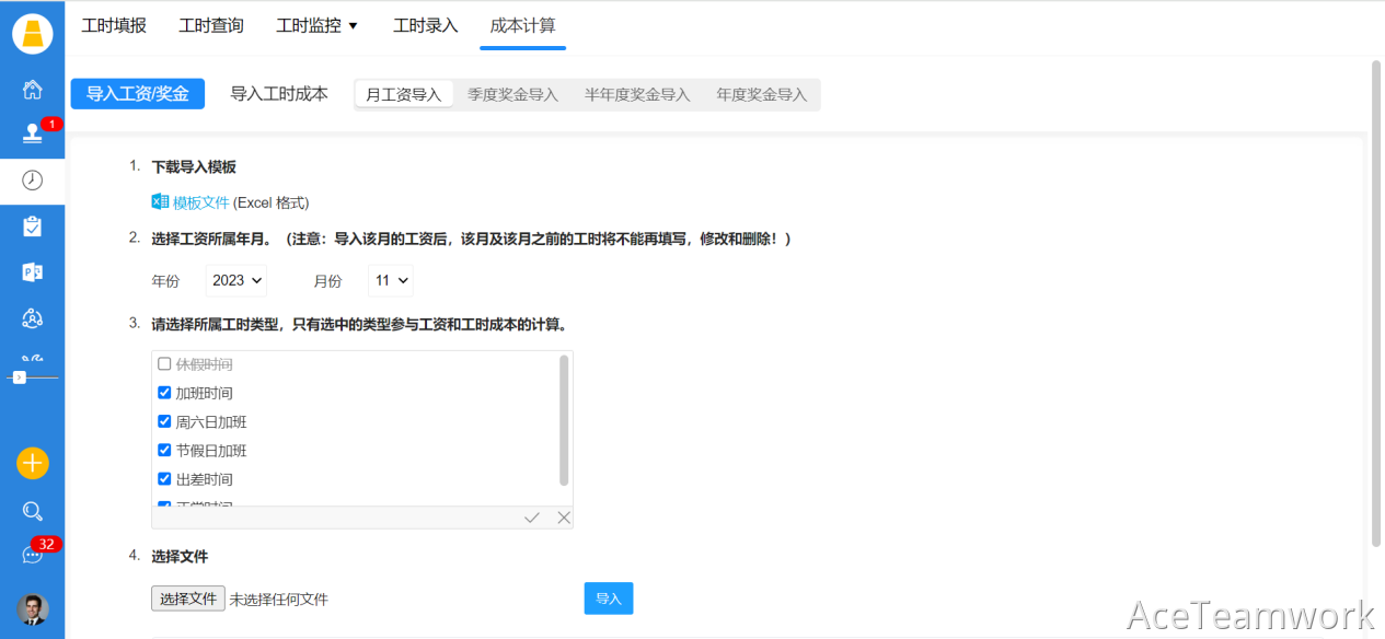 导入工资表的方式是通过导入员工上个月的实际工资,通过工资与实际工时的计算和分摊,将对应的成本分摊到每个工时数据。