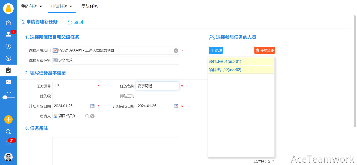 员工作为任务执行主体,可通过系统主动承接任务、补充细节,同时实时同步工作进展,让个人工作融入项目整体节奏。操作聚焦任务申请、进度更新,具体步骤如下: