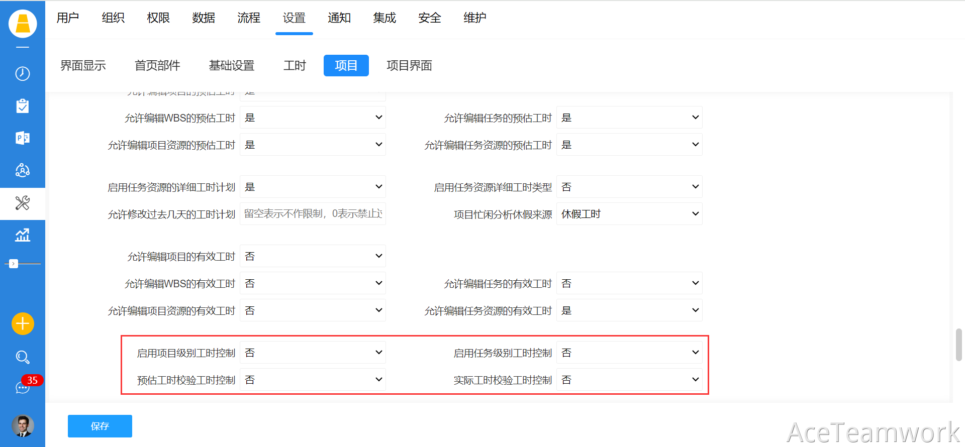 1、登录PC端系统管理员账号,进入首页→点击左侧导航栏的”设置”菜单→进入系统设置页面一点击主页面上方的“设置”菜单→再点击“项目”子菜单,则进入项目配置页面,可以开启“项目级/任务级工时控制”功能;