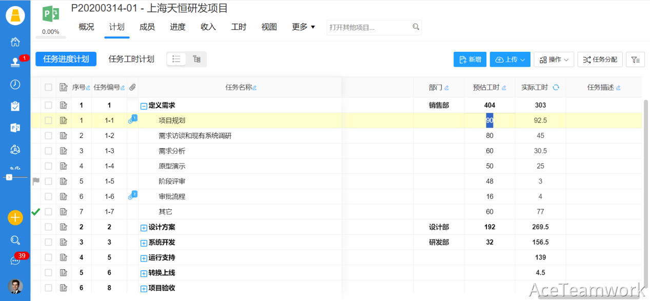 AceTeamwork支持无限层级的WBS任务分解,可按“项目类型”创建标准化任务模板,固化“立项→需求→设计→执行→测试→验收”的全流程任务结构,每个任务节点明确核心工作内容与工时预估参考值。例如,研发类项目可拆解出“需求调研、代码开发、系统测试、文档编写”等子任务,每个子任务预设合理工时范围,新项目直接套用模板,既提升预估效率,又确保预估颗粒度统一,从源头减少因任务拆解不清晰导致的工时偏差。