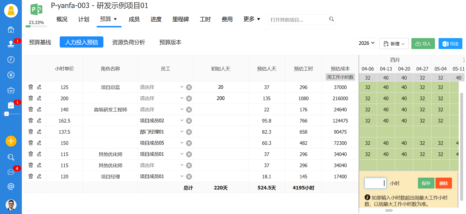为每个任务分配对应角色或具体人员,系统自动匹配预设的工时费率,生成人力成本明细,实现“工时预估→成本核算”的无缝衔接。例如,“需求调研”任务分配给高级产品经理(800元/小时),预估40小时,系统自动计算该任务人力成本为32000元;“基础功能开发”分配给初级研发工程师(300元/小时),预估80小时,成本为24000元。这种按角色分配工时的方式,既避免了“高职级人员做基础工作”的资源浪费,也让成本预算更精准,同时符合企业内控对人力成本分摊的规范要求。